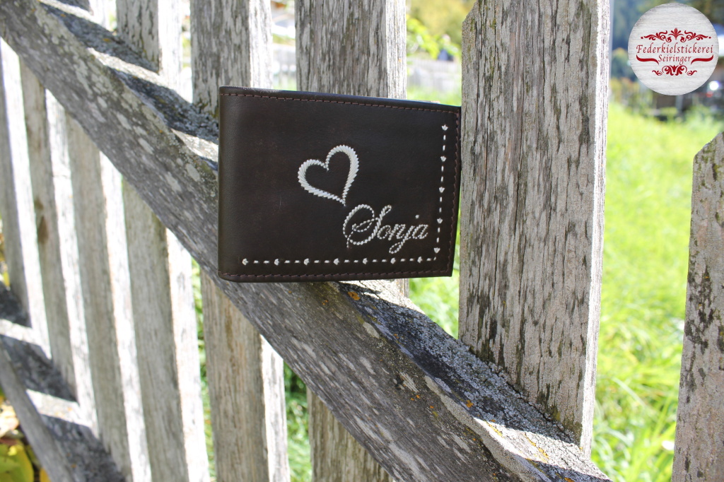 Diese Geldtasche wurde aus braunem Rindsleder gefertigt mit Instrument und Namen.