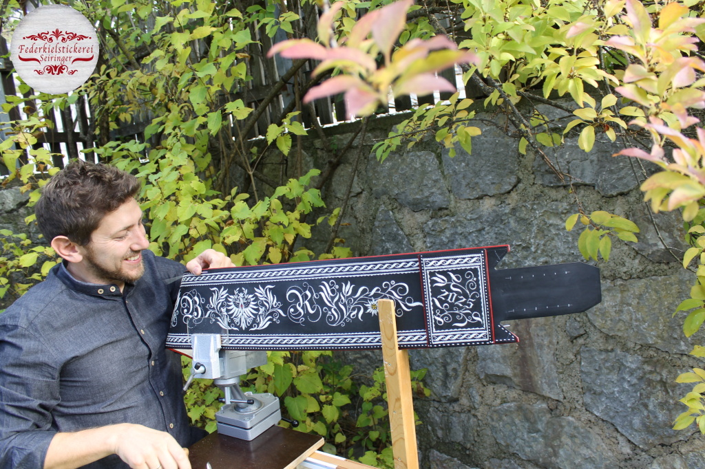 Man sieht Benni die Freude an, die er beim Sticken hat!Bauchbinden, Federkielsticken Rundum voll bestickte Bauchbinde!